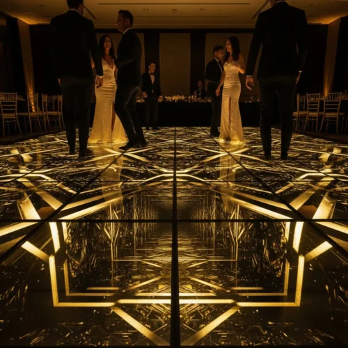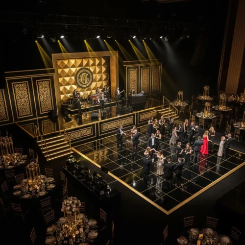 Plataformas modulares que proporcionan visibilidad y seguridad, creando puntos focales impactantes para artistas o pistas de baile.